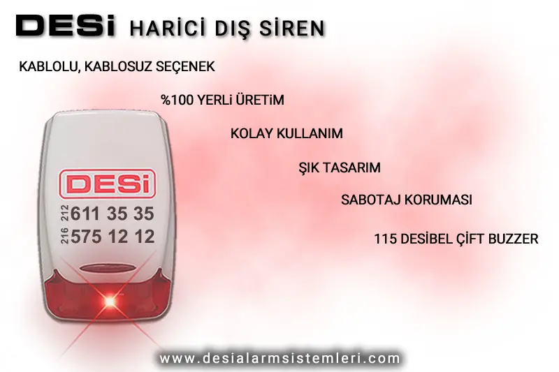 Dahili siren alarm panelinin içinde olmaktadır. Harici siren ise dış ortamlara kullanılır en büyük özelliği caydırıcılığıdır. Harici siren içinde 12 voltluk akü, LED flaş, çift buzzer sistemi ile 115 desibel ses yüksekliği mevcuttur. Detektörlerden gelen tetik hareketi ana panel vasıtası ile dış alan sirene gider ve çalmaya başlar.